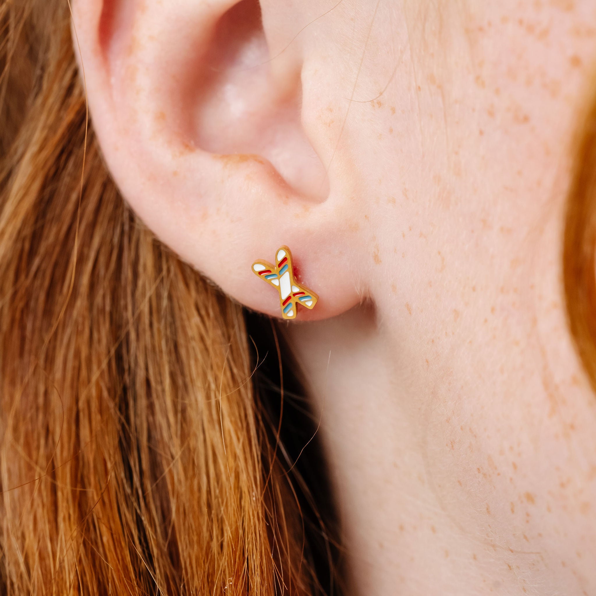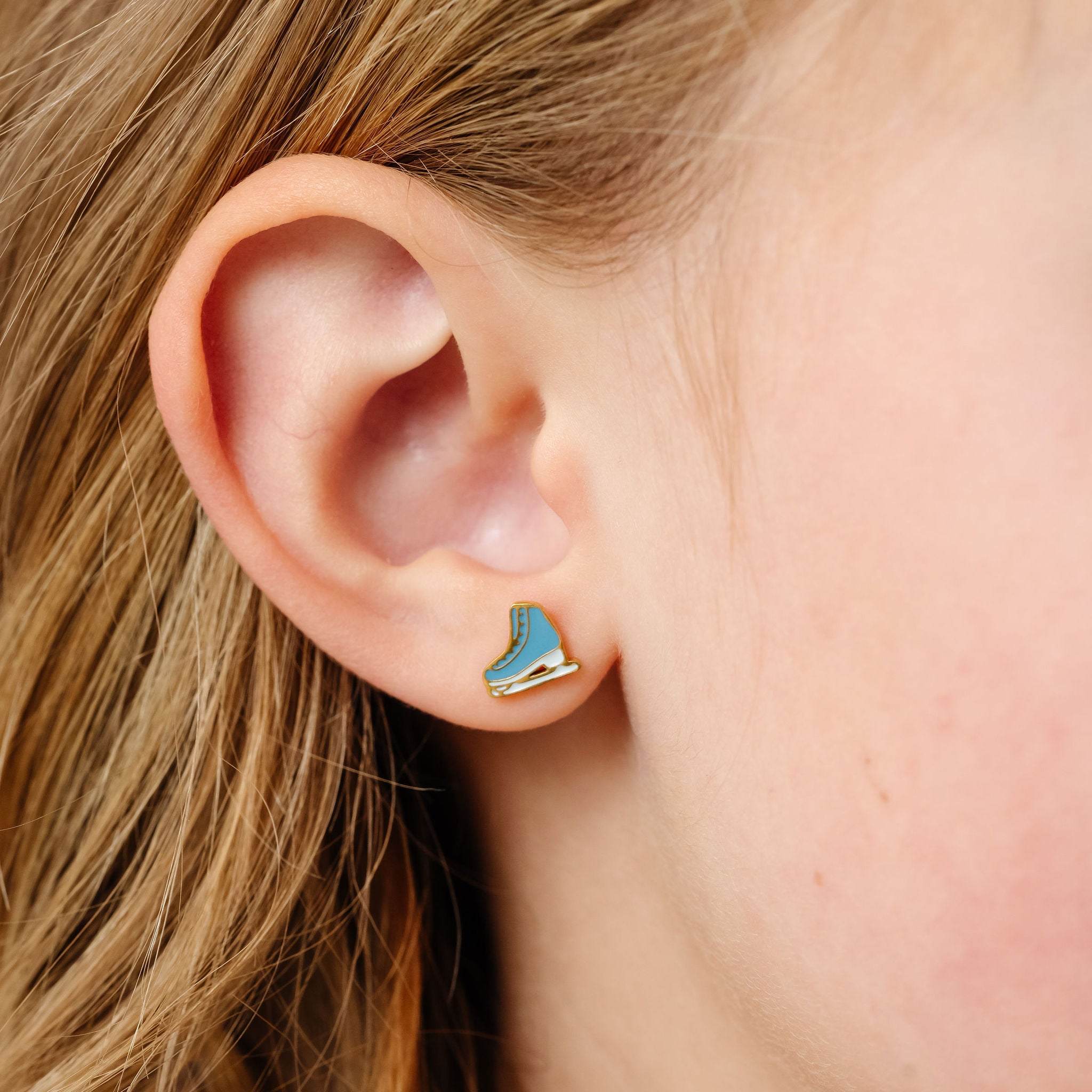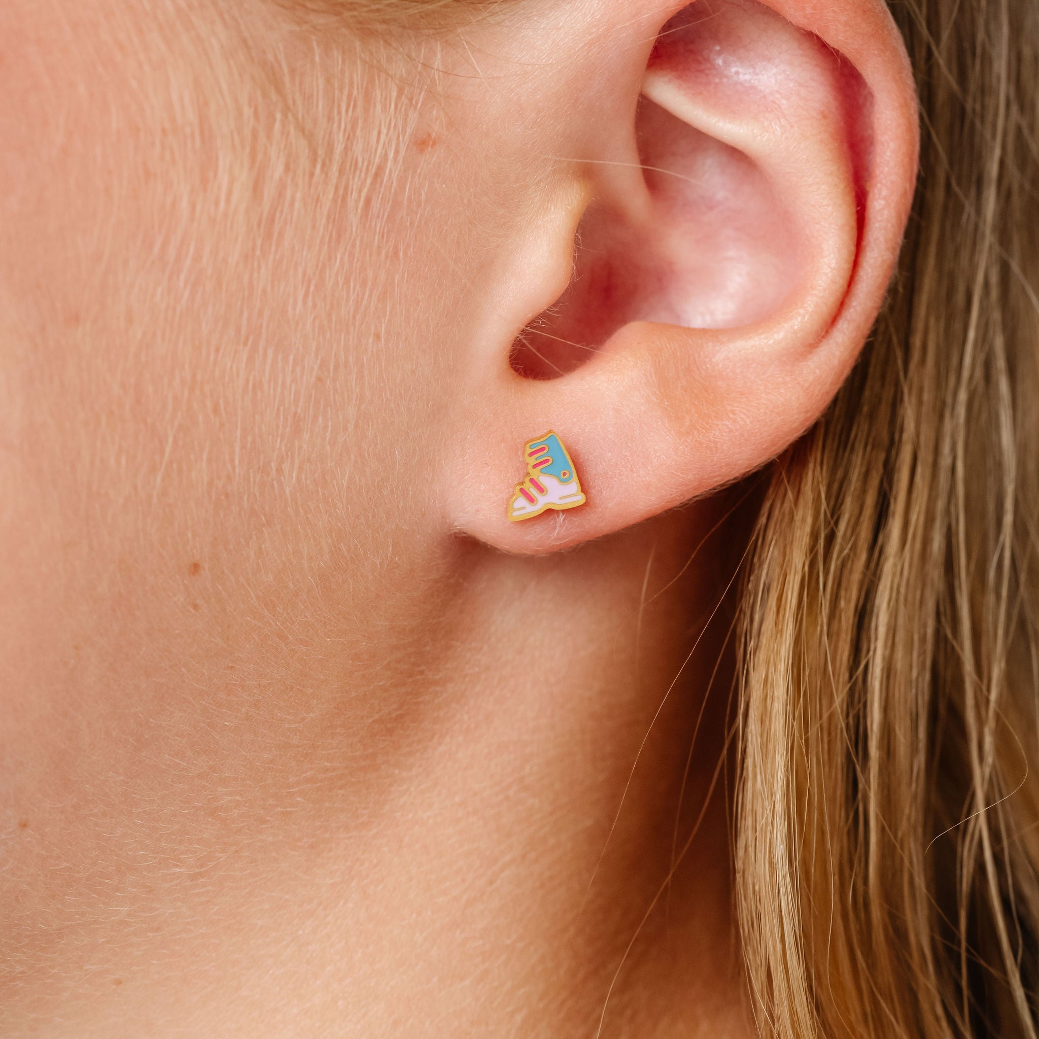 Pair of gold planet earth earrings with green blue enamel on a white background