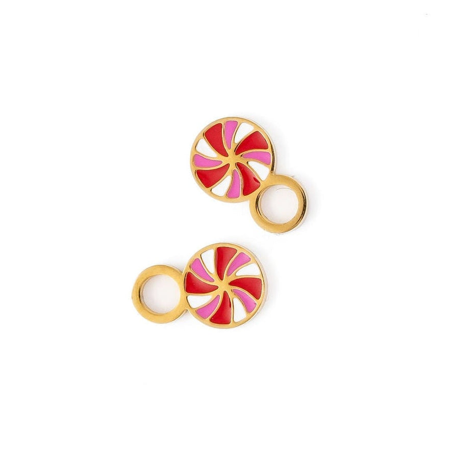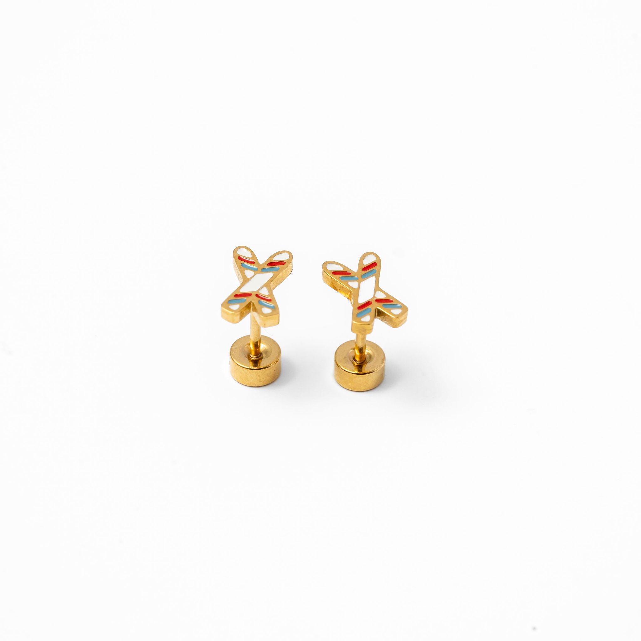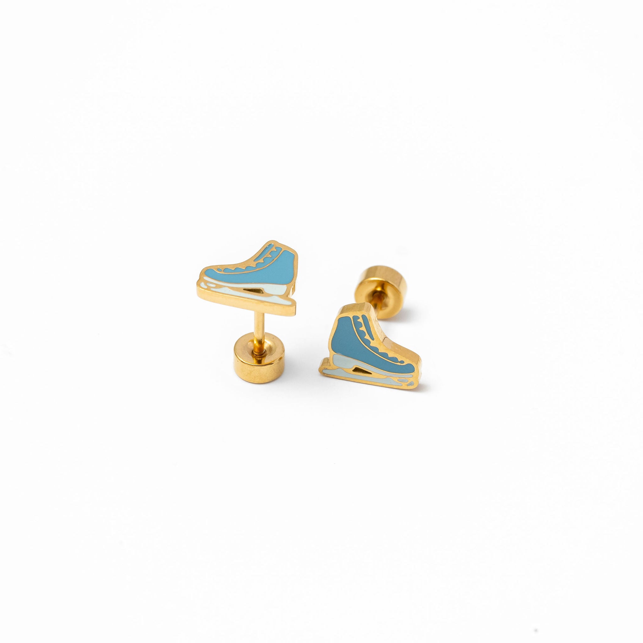 Pair of gold planet earth earrings with green blue enamel on a white background