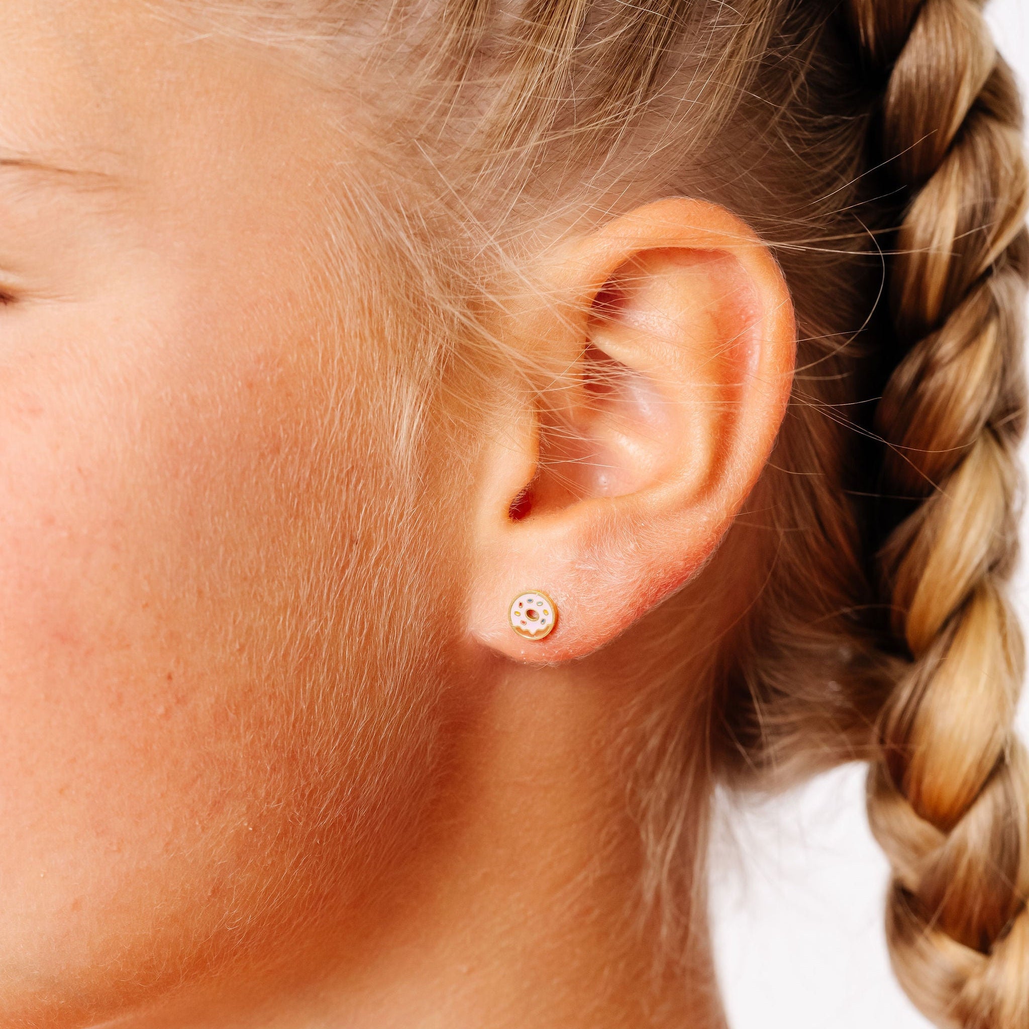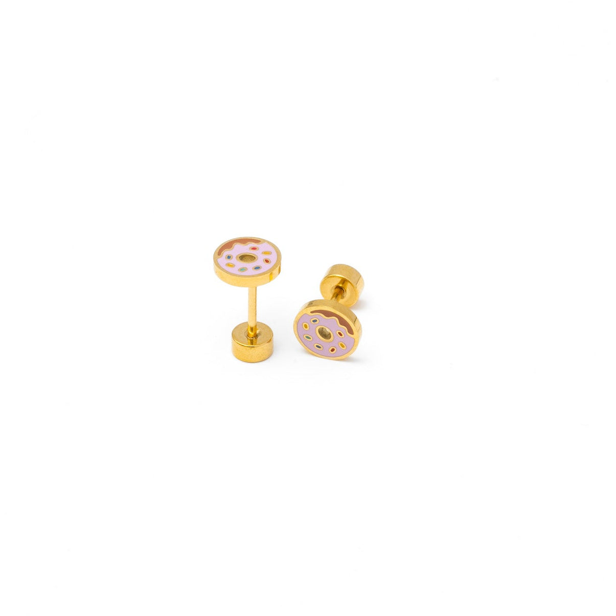 Pair of gold planet earth earrings with green blue enamel on a white background