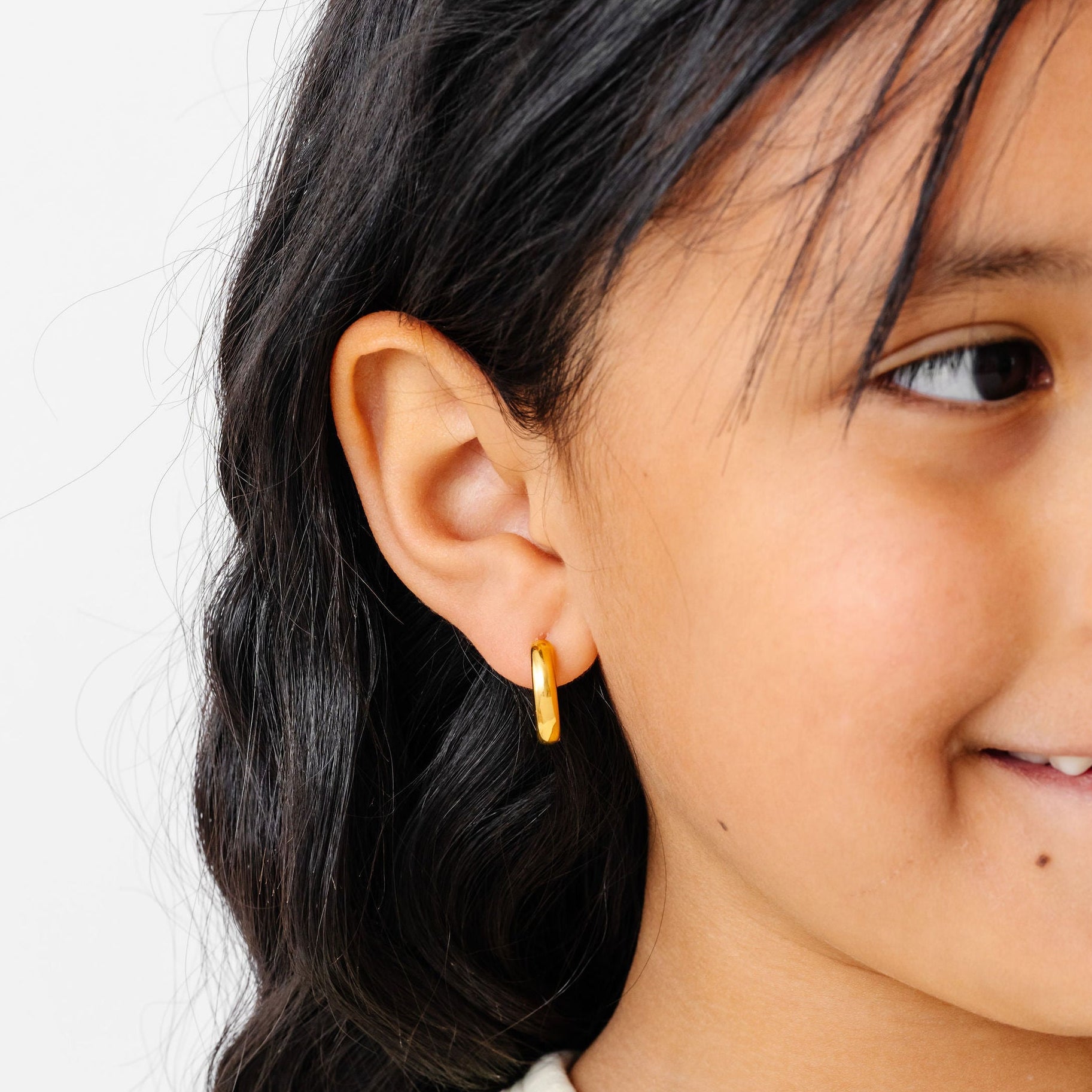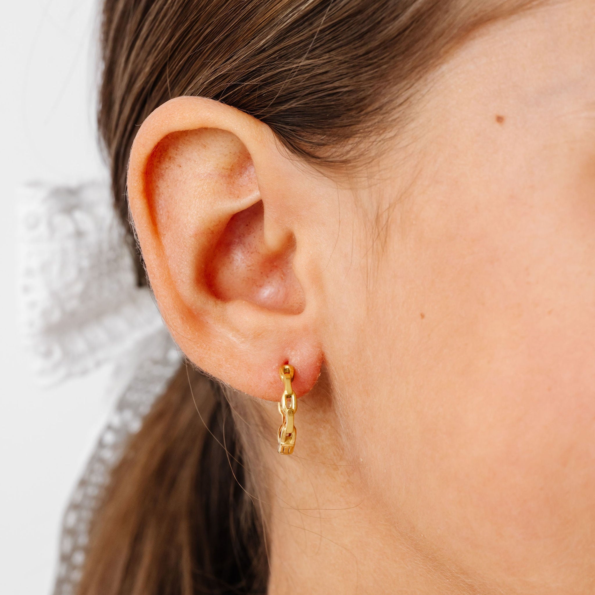 Girl wearing sunglasses with a clear blue sky and palm trees in the background earth earrings